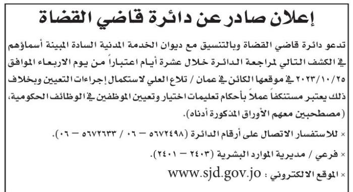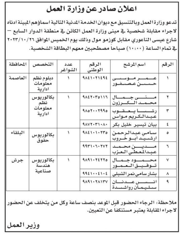 دعت عدد من الوزارات والمؤسسات الرسمية والبلديات بالتنسيق مع ديوان الخدمة المدنية اليومالثلاثاء، عددا من المرشحين لإجراء المقابلات الشخصية ولحضور الامتحان التنافسي واستكمال اجراءات التعيين.