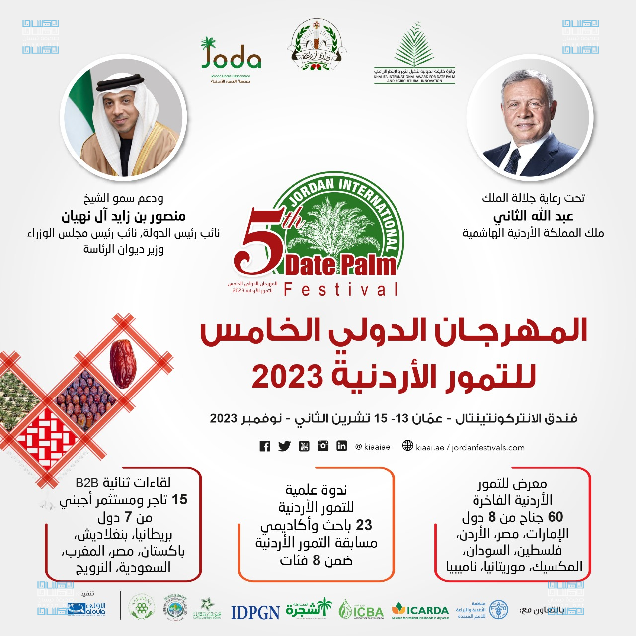 الحنيفات أكد في كلمته خلال حفل الافتتاح بأن هذا المهرجان يأتي تأكيداً على عمق العلاقات الأخوية على مر التاريخ بين دولتي الإمارات العربية المتحدة والمملكة الأردنية الهاشمية وبمكرمـــة مـــن ســـمو الشـــيخ منصـــور بـــن زايـــد آل نهيـــان، نائب رئيس الدولة، نائـــب رئيـــس مجلـــس الـــوزراء، وزيـــر ديوان الرئاســـة، بدولـــة الإمـــارات العربيـــة المتحـــدة وبنـــاء علـــى بروتوكـــول التعـــاون الموقـــع فـــي العاصمـــة عمّان بتاريـــخ 15/05/2023 ، بيـــن وزارة الزراعـــة بالمملكـــة الأردنيـــة الهاشـــمية والأمانـــة العامـــة لجائـــزة خليفـــة الدوليــة لنخيــل التمــر والابتــكار الزراعــي، وجمعيــة التمــور الأردنيــة وبالتعـــاون مـــع المنظمـــات والمراكز العالمية.
