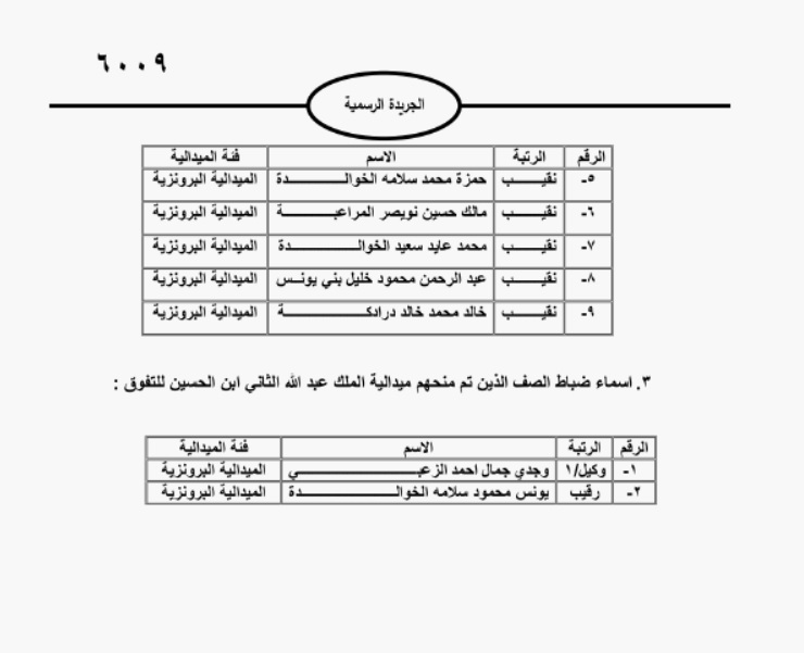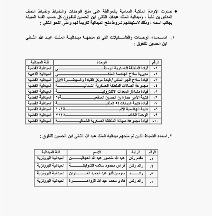 نيسان ـ صدر في عدد الجريدة الرسمية اليوم الخميس، الإرادة الملكية السامية بالموافقة على منح وحدات وضباط وضباط صف، ميدالية الملك عبدالله الثاني ابن الحسين للتفوق.