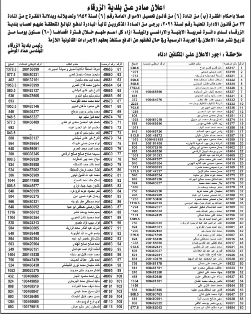 بلدية الزرقاء تطالب مواطنين بذمم مالية (أسماء)