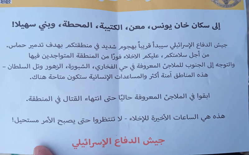 ودعا جيش الاحتلال سكان بعض أحياء خان يونس جنوب قطاع غزة إلى إخلاء منازلهم"، وذلك عبر منشورات أسقطتها الطائرات الصهيونية على عدد من الأحياء في خان يونس.