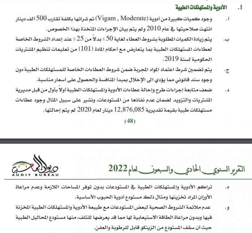 وقال الديوان في تقريره إنه تبين ضعف متابعة اجراءات طرح وإحالة عطاءات الأدوية والمستهلكات الطبية أولا بأول من قبل من قبل مديرية المشتريات والتزويد لضمان عدم نفاذها من المستودعات، مشيرا إلى وجود عطاءات مستهلكات طبية بقيمة تقديرية 12 مليونا و876 ألفا و85 دينارا لعام 2020 لم يتم احالتها.