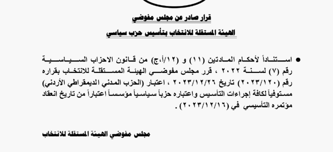نيسان ـ قرر مجلس مفوضي الهيئة المستقلة للإنتخاب اعتبار الحزب المدني الديمقراطي الأردني مستوفيا لكافة اجراءات التأسيس واعتباره حزبا سياسيا مؤسسا بدءا من تاريخ انعقاد مؤتمره التأسيسي في 26-12-2023.