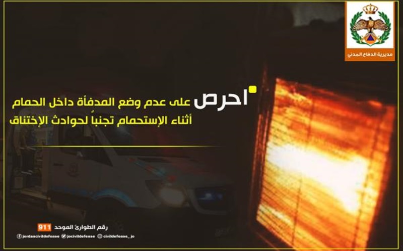 وقالت مديرية الدفاع المدني في تغريدة عبر إكس، "احرص على عدم وضع المدفأة داخل الحمام أثناء الاستحمام تجنبا لحوادث الاختناق".
