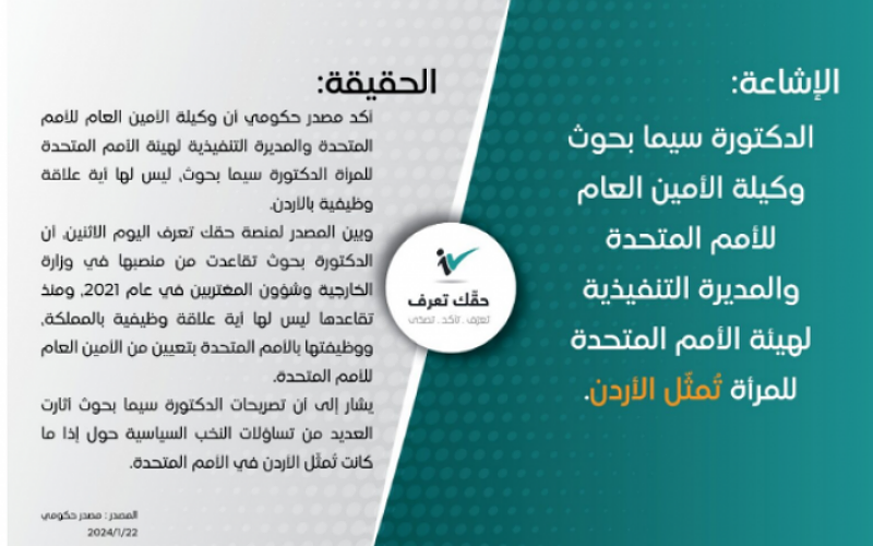 وبين المصدر لمنصة حقك تعرف اليوم الإثنين، أن الدكتورة سيما بحوث تقاعدت من منصبها في وزارة الخارجية وشؤون المغتربين في عام 2021، ومنذ تقاعدها ليس لها أية علاقة وظيفية بالمملكة، ووظيفتها بالأمم المتحدة بتعيين من الأمين العام للأمم المتحدة