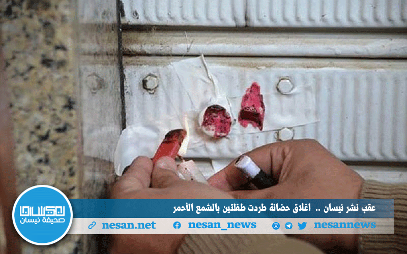 نيسان ـ قال مصدر مسؤول فضل عدم ذكر اسمه، انه جرى إغلاق حضانة في منطقة أبو علندا بالشمع الأحمر، عقب طردها طفلتين إلى الشارع صباح اليوم.