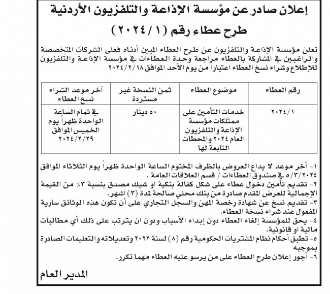 نيسان ـ طرحت مؤسسة الإذاعة والتلفزيون الأردنية، الأحد، عطاء "خدمات التأمين على ممتلكات المؤسسة 2024 والمحطات التابعة لها".