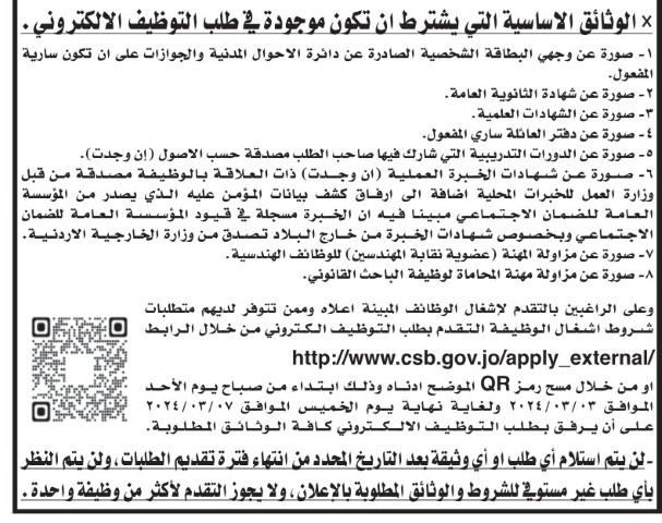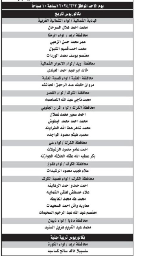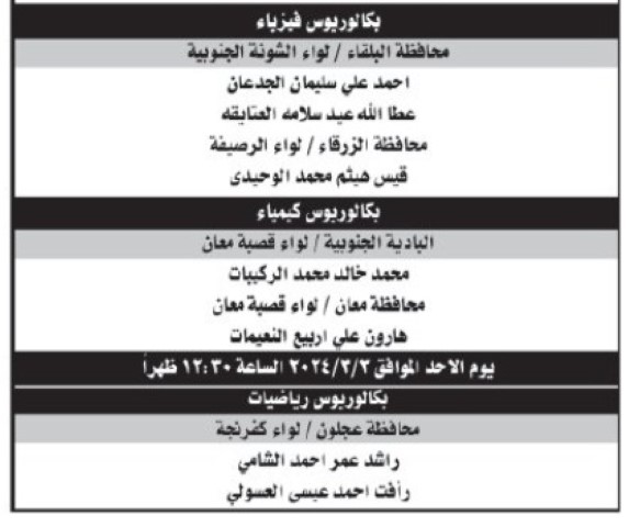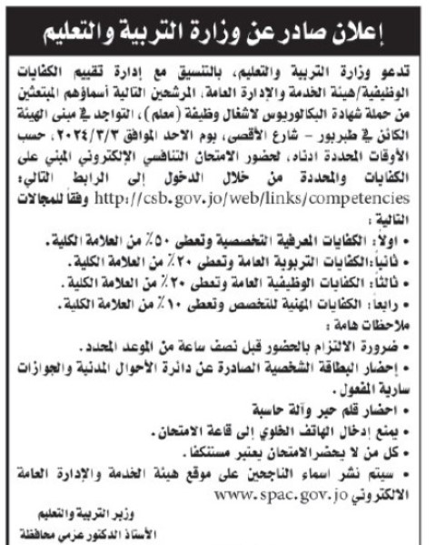 نيسان ـ دعت وزارة التربية والتعليم، بالتنسيق مع إدارة تقييم الكتابات الوظيفية / هيئة الخدمة والإدارة العامة المرشحين التالية أسماؤهم المبتعثين من حملة شهادة البكالوريوس لاشغال وظيفة معلم، التواجد في مبنى الهيئة الكائن في طبربور - شارع الأقصى، يوم الأحد الموافق 2024/3/3 ، حسب الأوقات المحددة أدناه لحضور الامتحان التنافسي الإلكتروني.