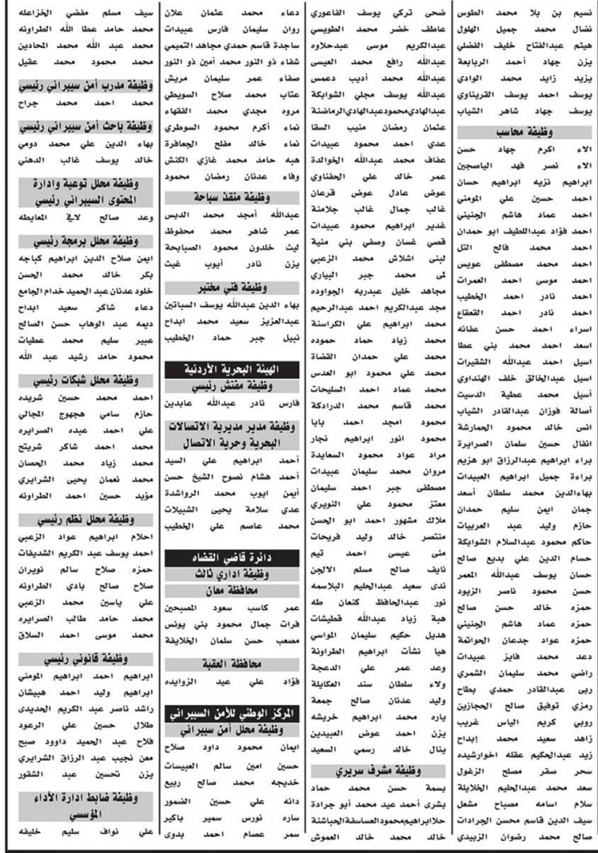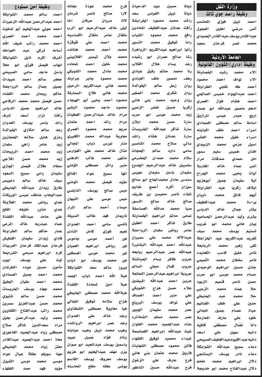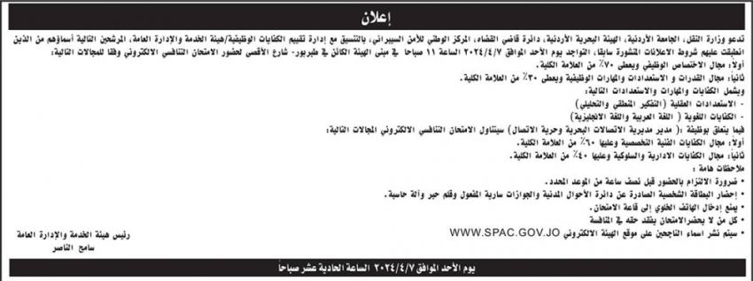 وشملت المؤسسات كل من وزارة النقل: الجامعة الأردنية: الهيئة البحرية الأردنية؛ دائرة قاضي القضاة, المركز الوطني للأمن السيبراني بالتنسيق مع هيئة الخدمة والإدارة العام، التالية أسمائهم للامتحان التنافسي.