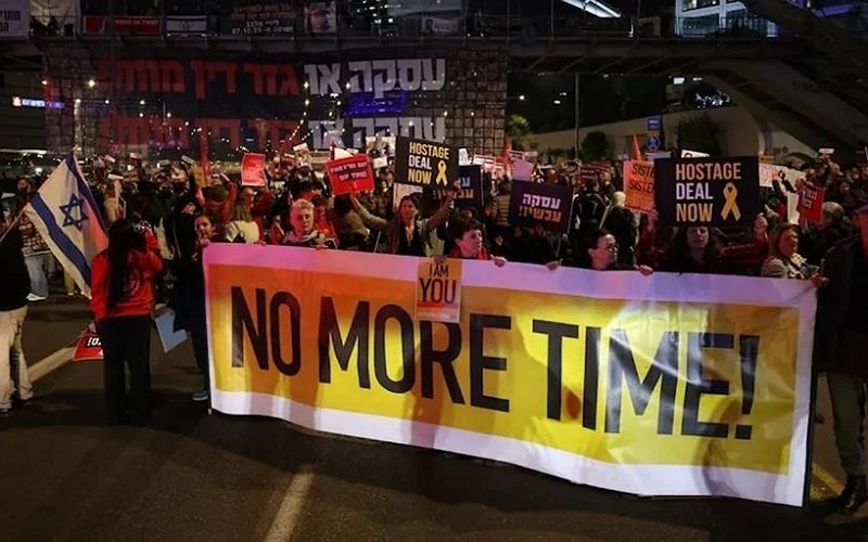 ومساء السبت، انطلقت تظاهرات ضخمة في "تل أبيب"، شارك بها عشرات آلاف المستوطنين، للضغط على حكومة نتنياهو لإبرام صفقة تبادل مع حركة "حماس"، وإجراء انتخابات مبكرة.