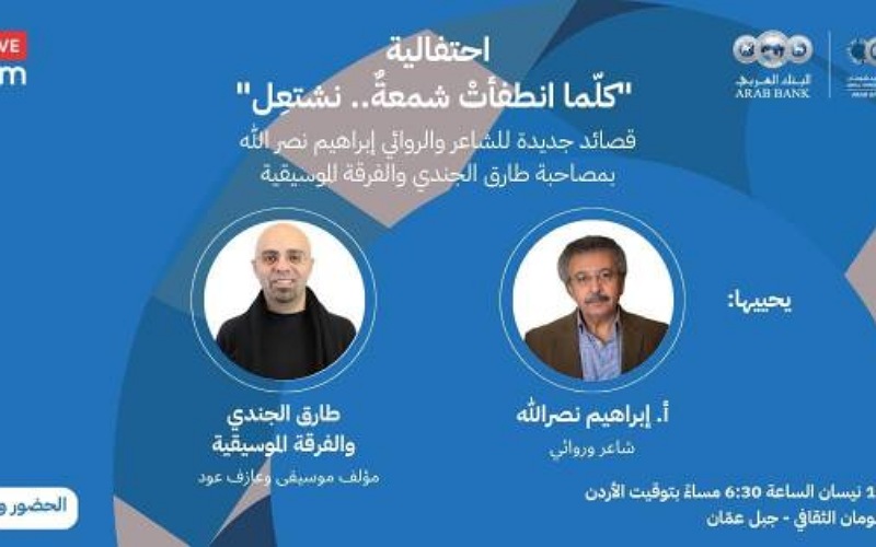 نيسان ـ دعا منتدى مؤسسة عبد الحميد شومان الثقافي، ذراع البنك العربي للمسؤولية الثقافية والاجتماعية، لحضور أمسية شعرية وموسيقية بمشاركة الشاعر إبراهيم نصر الله والموسيقار طارق الجندي.