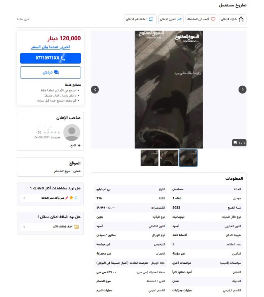 المواطن وضع مجموعة مواصفات وصور للصاروخ، ذاكرا انه من نوع "بي ام دبليو" وأنه تعرض لحادث (أضرار جسيمة في البودي)، وان طريقة الدفع بالأقساط.