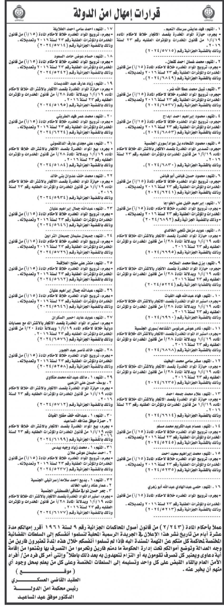 وأمر القاضي المساعيد كل فرد من أفراد الأمن العام بإلقاء القبض على كل واحد وتسليمه إلى السلطات المختصة، وعلى كل من يعلم بمحل وجود أي منهم أن يخبر عنه".