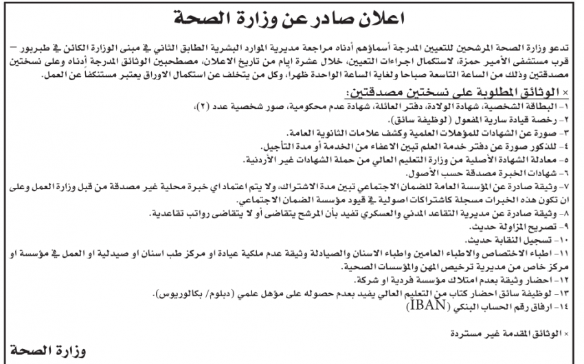 نيسان ـ دعت وزارة الصحة بالتنسيق مع ديوان الخدمة المدنية، مجموعة من المرشحين، مراجعة الوزارة لاستكمال إجراءات التعيين.