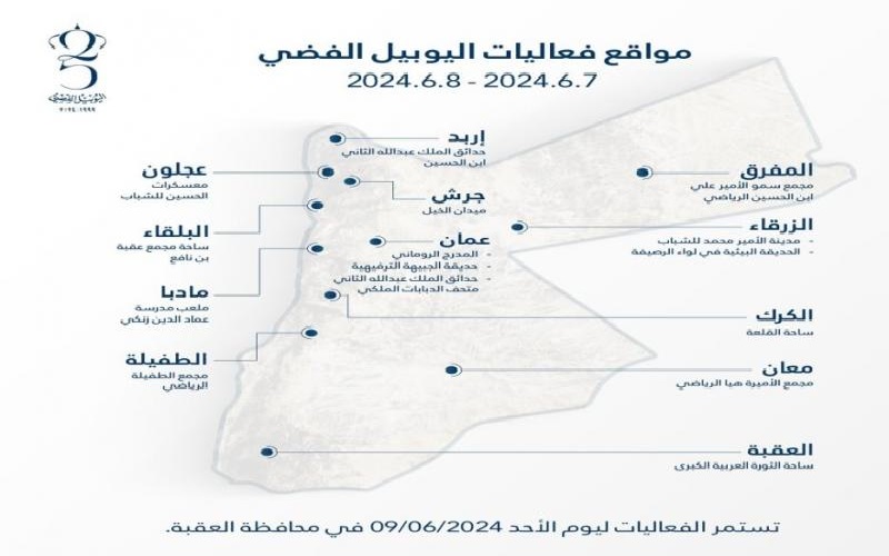 نيسان ـ تقام فعاليات وأنشطة يومي الجمعة والسبت "7 و8 حزيران "في جميع المحافظات، بمناسبة اليوبيل الفضي لتسلم جلالة الملك عبد الله الثاني سلطاته الدستورية، وجلوس جلالته على العرش.