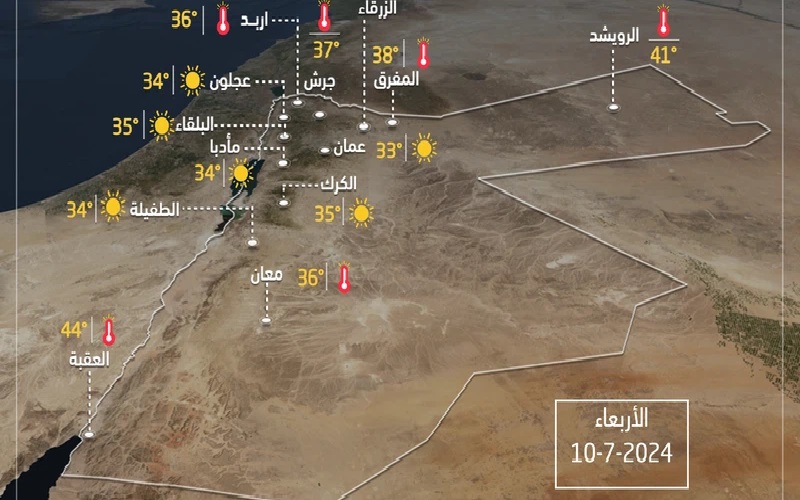 وتكون الأجواء حارة في جميع مناطق المملكة، وشديدة الحرارة في الأغوار والبحر الميت والعقبة، حيث تقترب درجات الحرارة من الـ 45 مئوية، مع ظهور السحب المتفرقة في مناطق البادية.
