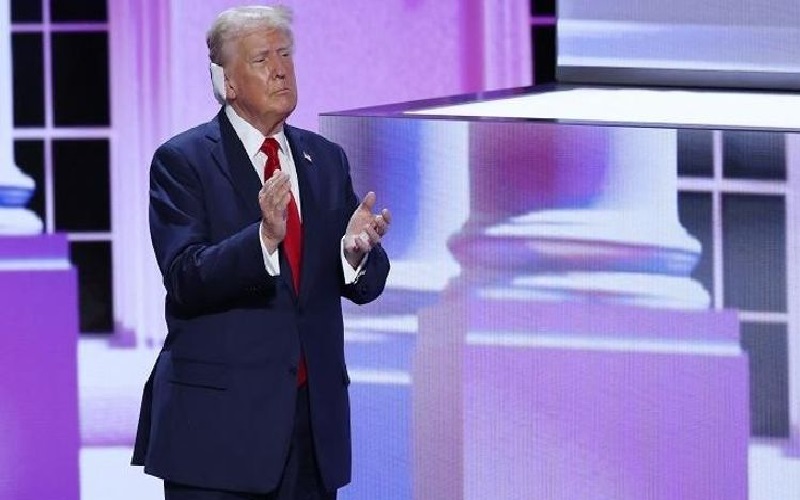 وفي أول خطاب يلقيه منذ تعرضه لمحاولة اغتيال يوم السبت الماضي، ظهر ترامب مغطيا أذنه اليمنى بضمادة بيضاء، وبدا ثابتا ولم يتأثر بالمحاولة.