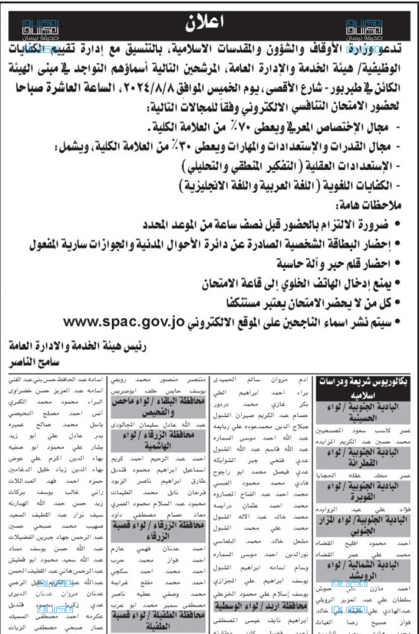 نيسان ـ دعت وزارة الأوقاف والشؤون والمقدسات الإسلامية اليوم الأحد وبالتنسيق مع إدارة تقييم الكفايات الوظيفية/هيئة الخدمة والإدارة العامة، المرشحين التالية أسماؤهم من حملة شهادات بكالوريوس شريعة ودراسات إسلامية إلى حضور الامتحان التنافسي الإلكتروني بحسب المواعيد المدرجة أدناه.