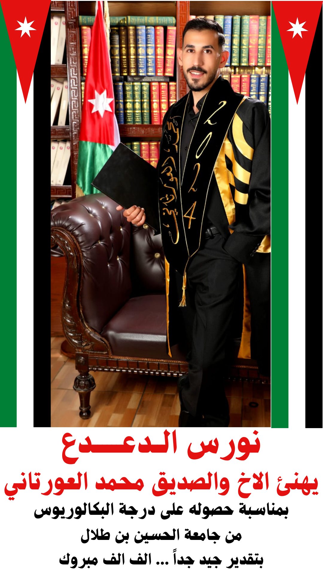 نيسان ـ يتقدم نورس الدعدع بالتهنئة والتبريك إلى الاخ والصديق محمد العورتاني بمناسبة تخرجه وحصوله على درجة البكالوريوس من جامعة الحسين بن طلال بتقدير جيد جداً..