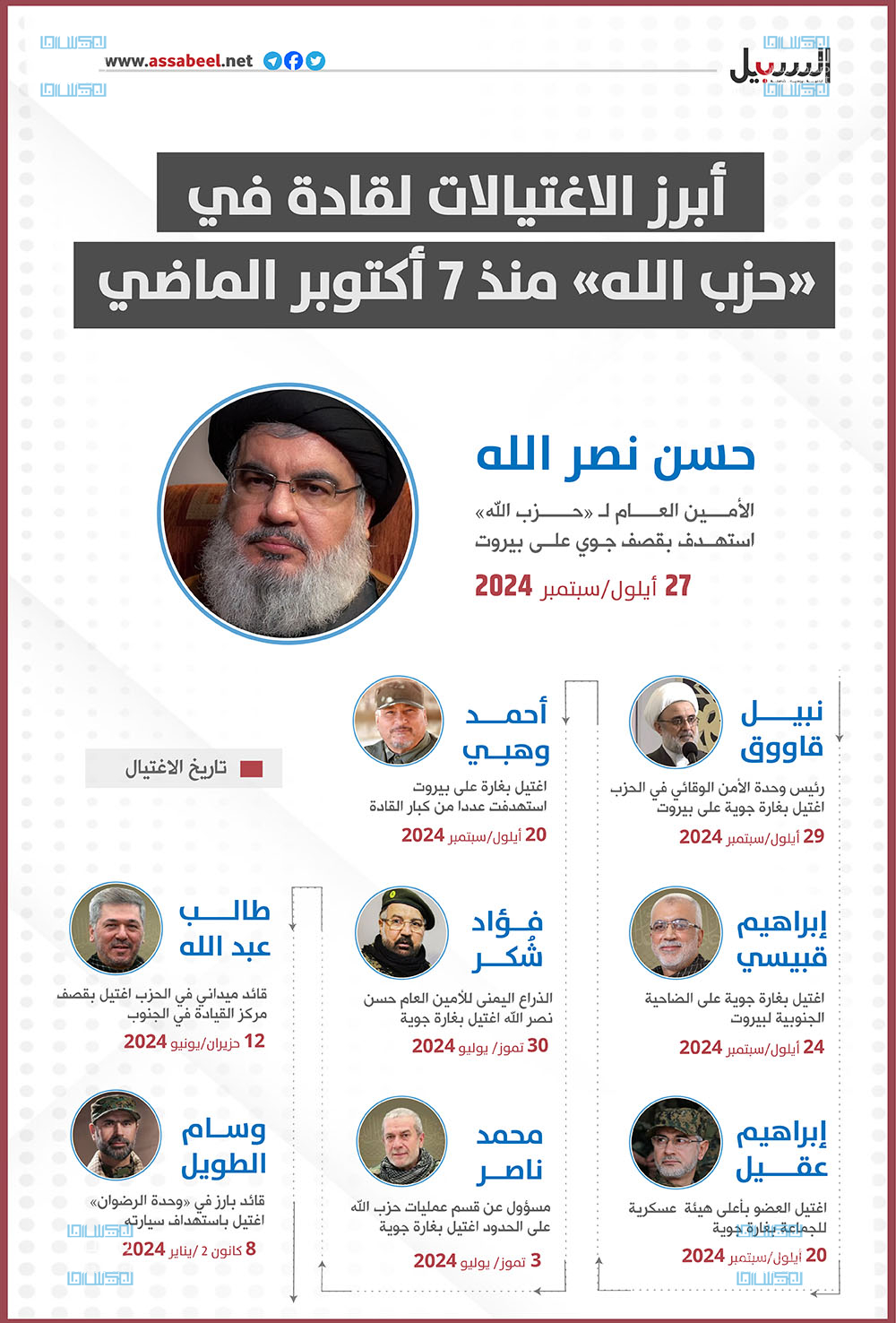 نيسان ـ يتبع الاحتلال الإسرائيلي في الحرب التي يشنها على لبنان سياسة اغتيال القيادات البارزة في "حزب الله"، كان أبرزها اغتيال الأمين العام للحزب حسن نصر عبر استهداف مقر القيادة الذي كان يتواجد فيه.