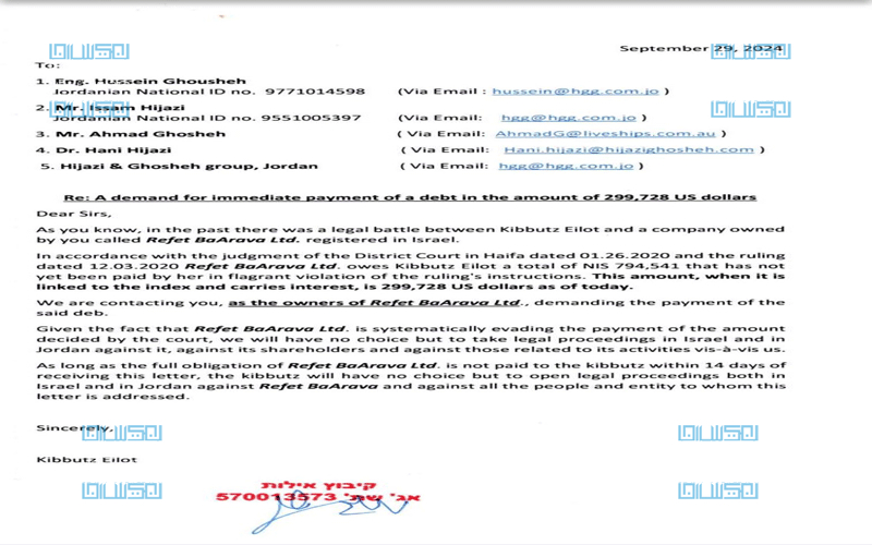 مصادر أسرت لموقع نيسان أن كيبوتس Eilot سوف يرفع قضية على حجازي و غوشة في الاردن إذا لم تدفع لهم مستحقاتهم حسب الوثيقة المرفقة.