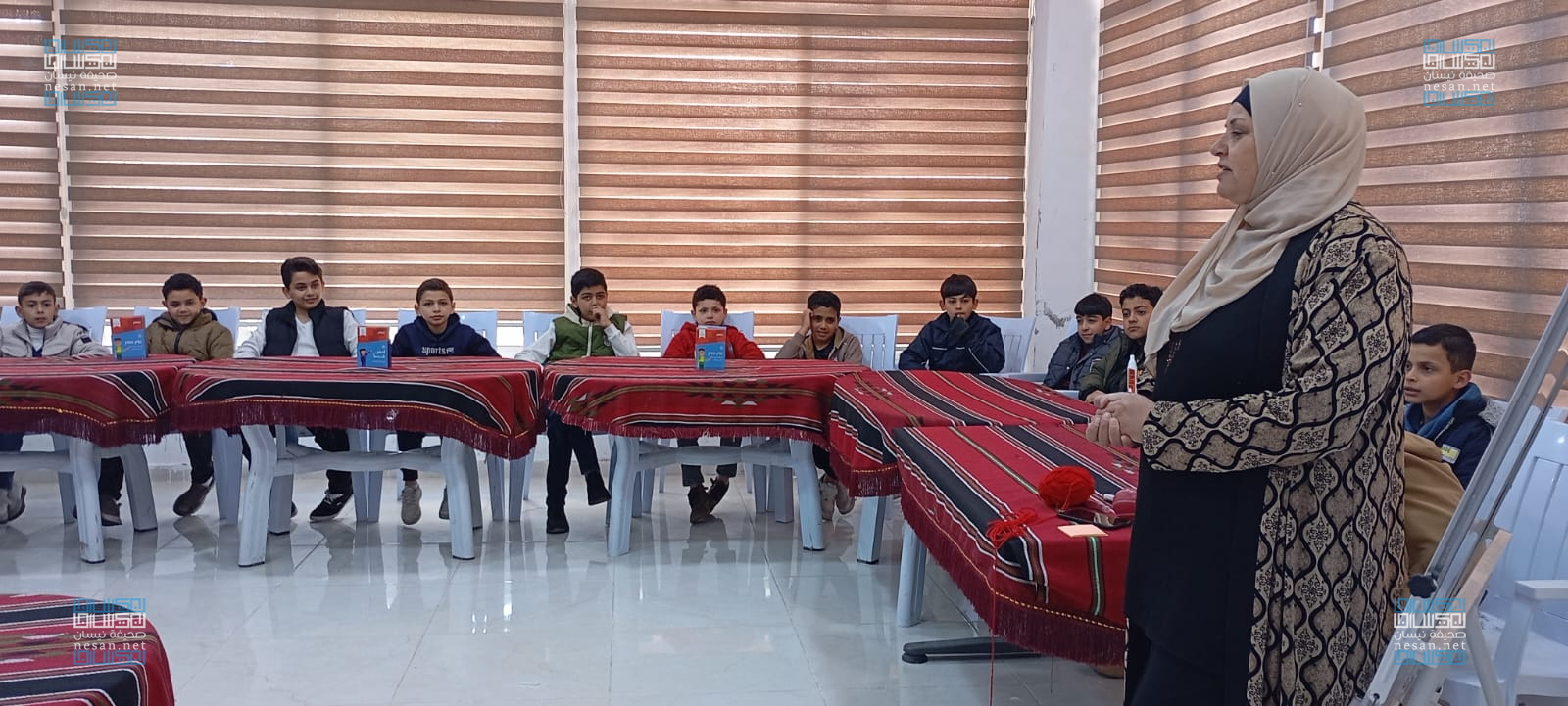 تحدث المدرب أحمد اليوسف عن تاريخ وأهمية الفسيفساء وأنواعها وعن أهم المعدات والأدوات اللازمة للعمل والتعرف على إستخدام الأحجار بطريقة صحيحة وكيفية عمل أشكال هندسيه والكتابات ورسم الجداريات ورسم شجرة مأدبا واريحا .