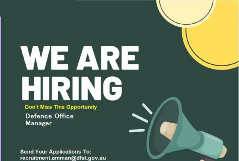 نيسان ـ أعلنت السفارة الأسترالية في عمّان عن توفر فرصة عمل لديها لشغل وظيفة مدير مكتب الدفاع، داعية الأشخاص ذوي الكفاءة العالية والأداء المتميز إلى التقدم للوظيفة.