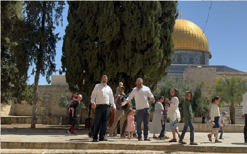 وادى المستوطنون صلواتهم خلال اقتحام الأقصى، وشكلوا حلقات الرقص والغناء خلال اقتحام الأقصى وسيرهم فيه.