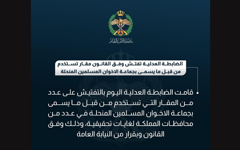 نيسان ـ قالت مديرية الامن العام، إن الضابطة العدلية قامت اليوم الاربعاء، بالتفتيش على عدد من المقار التي تستخدم من قبل ما يسمى بجماعة الإخوان المسلمين المنحلة في عدد من محافظات المملكة.