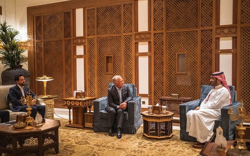 وحضر اللقاء مدير مكتب الملك، المهندس علاء البطاينة، ومن الجانب السعودي الأمير خالد بن سلمان بن عبدالعزيز وزير الدفاع، والأمير فيصل بن فرحان بن عبدالله وزير الخارجية، وعدد من كبار المسؤولين.