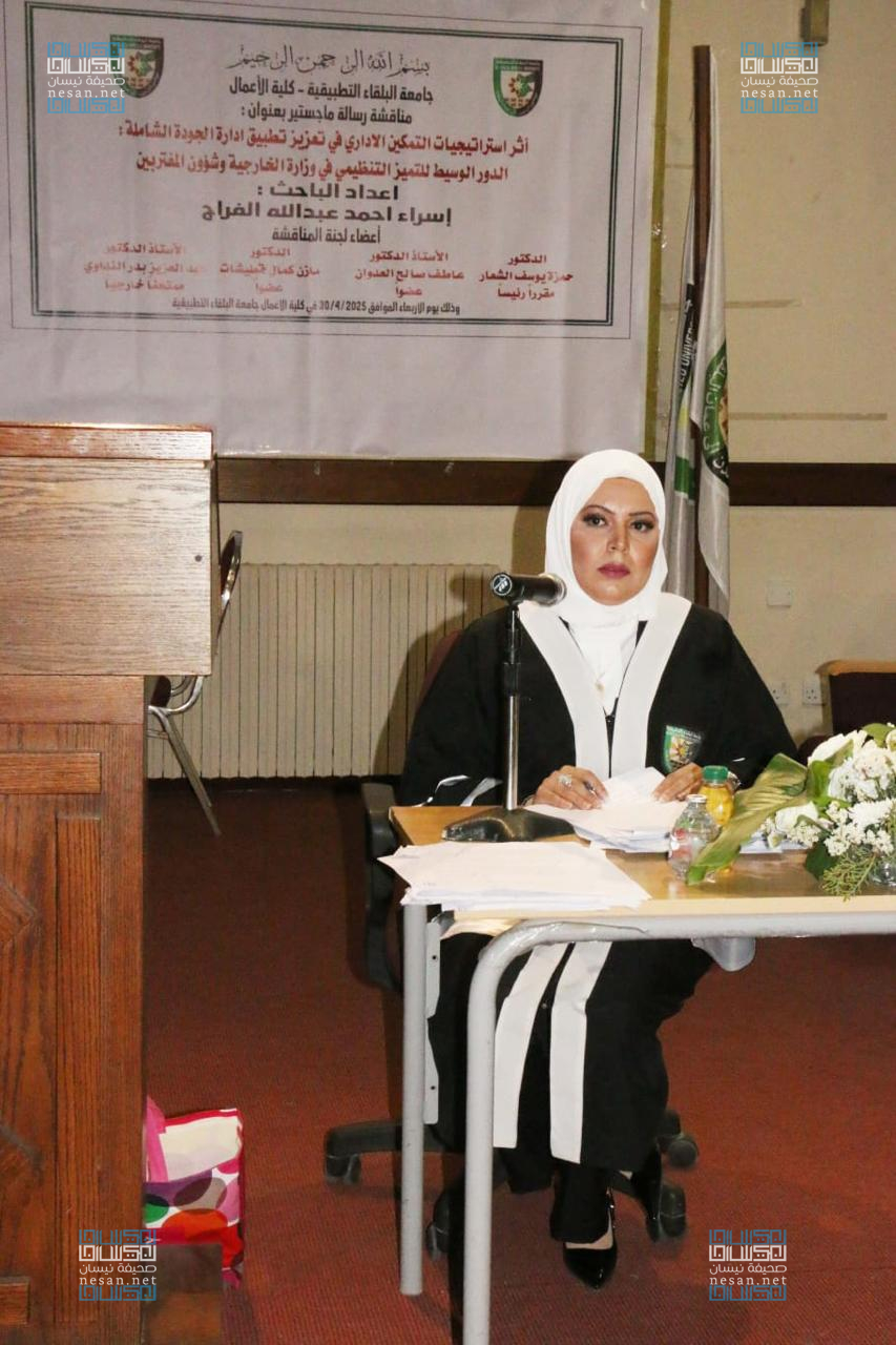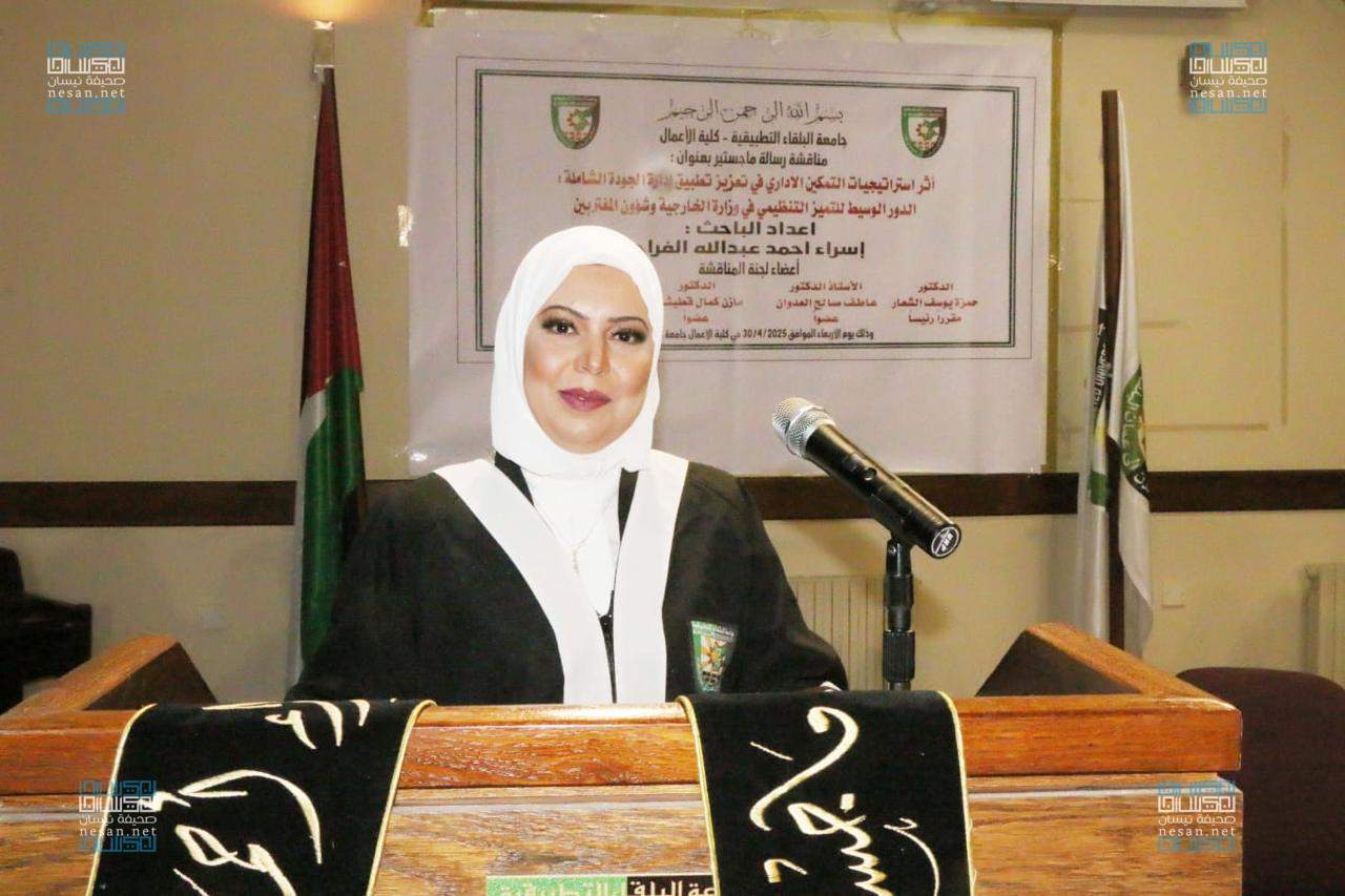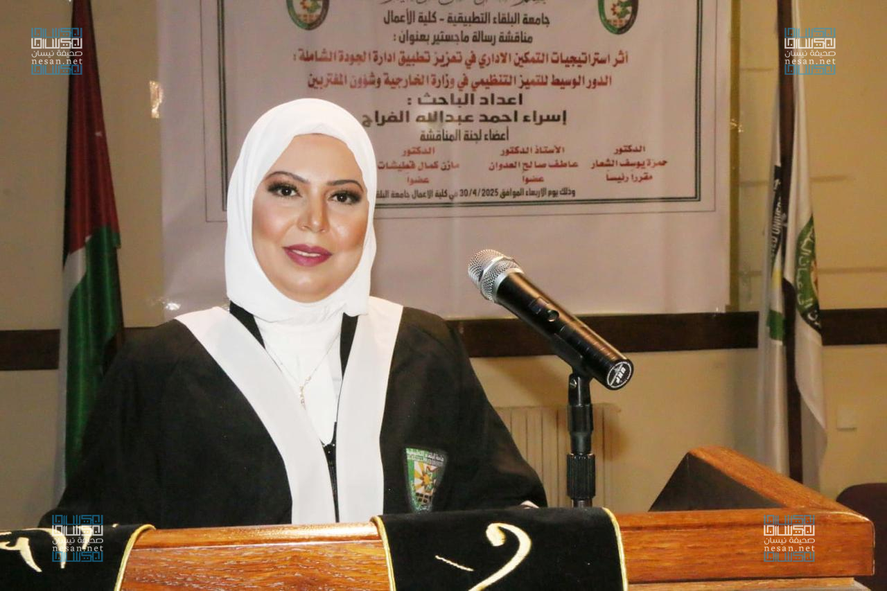 نيسان ـ يتقدم والدا وزوج اسراء احمد الفراج محمد نصري النوافعة بالتهنئة والتبريكات لحصولها على شهادة الماجستير من جامعة البلقاء التطبيقية وكلية عمان الجامعية بعنوان اثر استراتيجيات التمكين الاداري في تعزيز تطبيق ادارة الجودة الشاملة: الدور الوسيط للتميز التنظيمي في وزارة الخارجية وشؤون المغتربين.