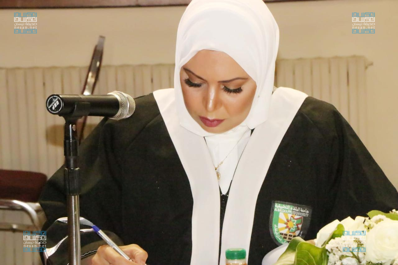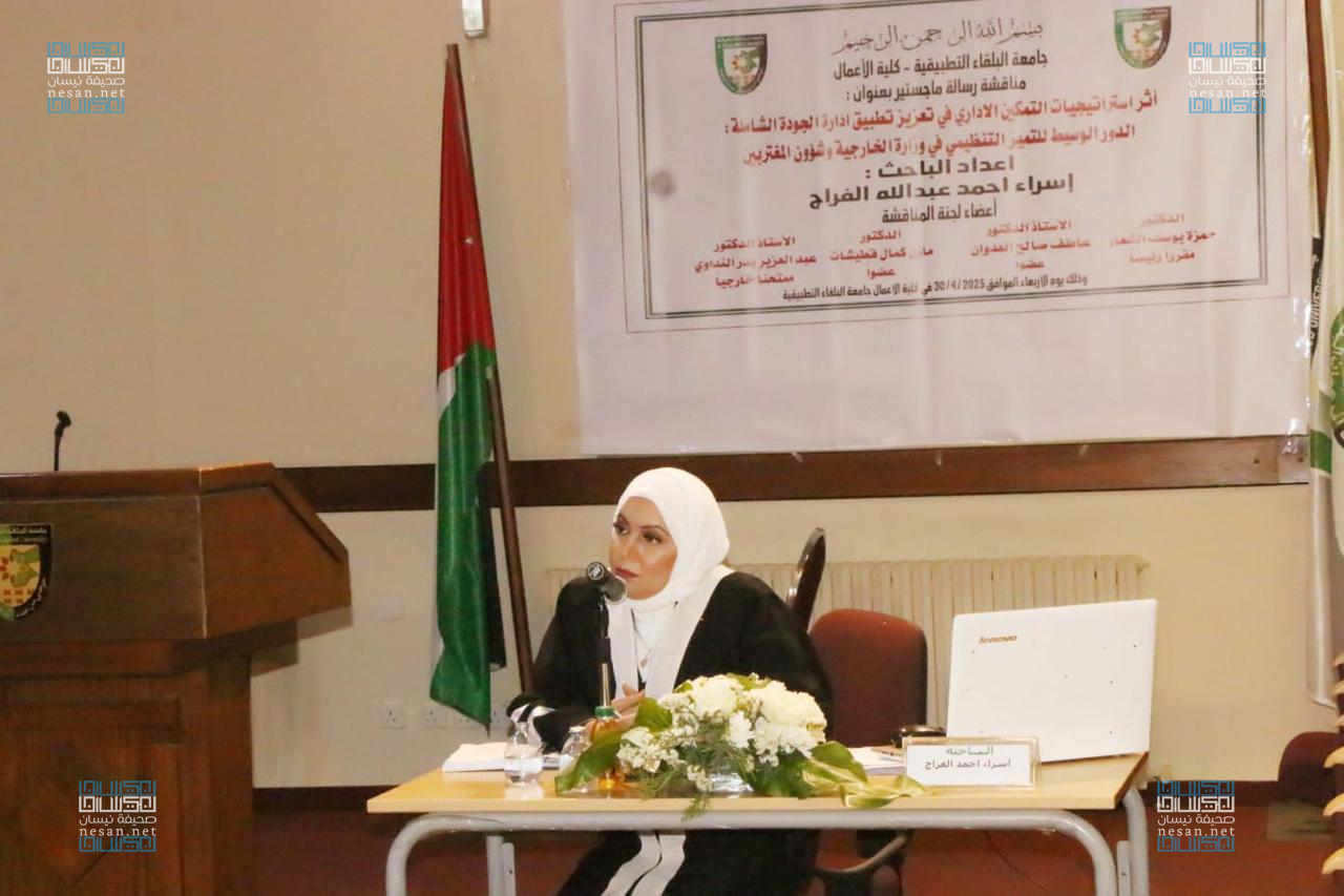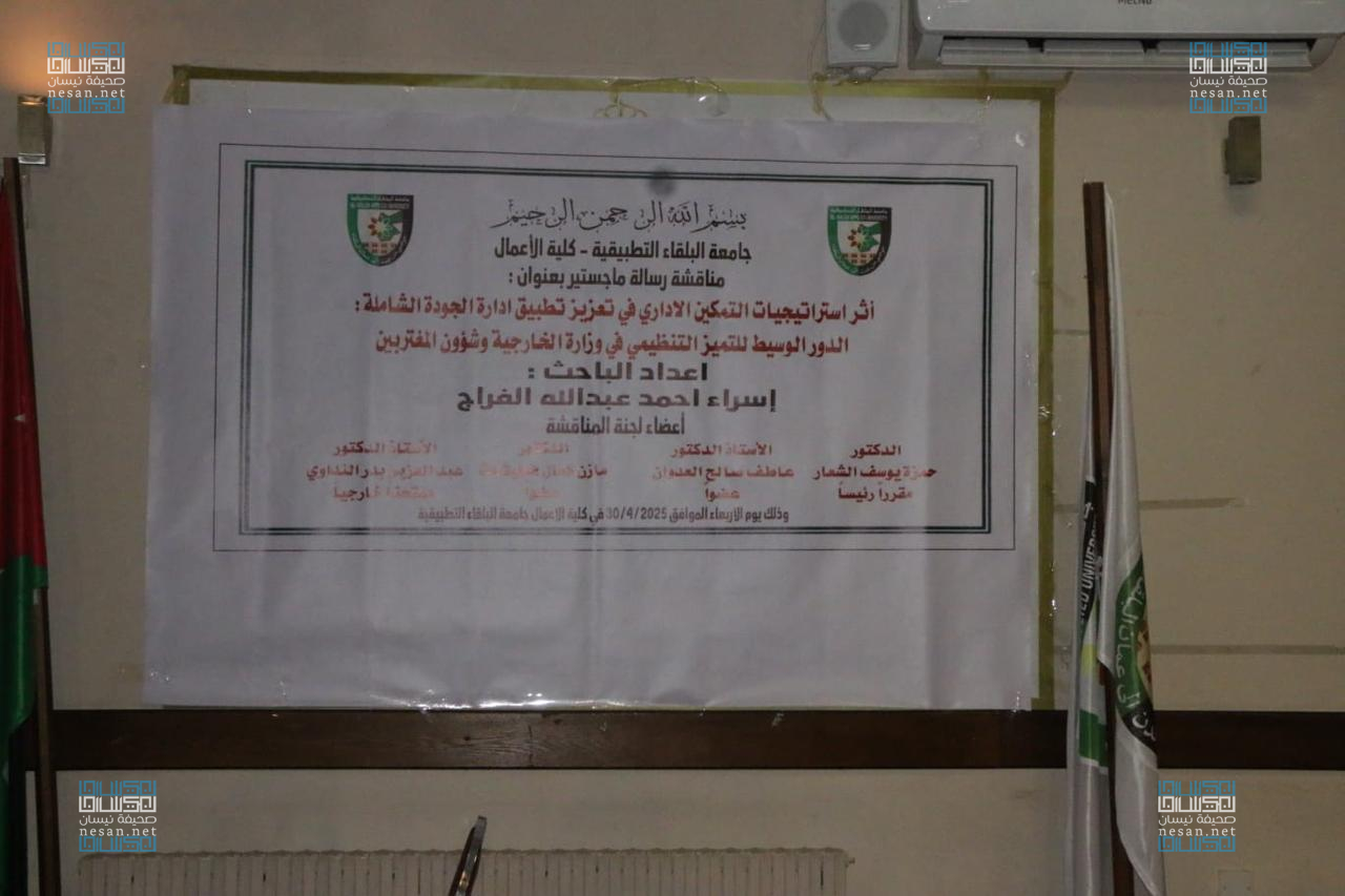 نيسان ـ يتقدم والدا وزوج اسراء احمد الفراج محمد نصري النوافعة بالتهنئة والتبريكات لحصولها على شهادة الماجستير من جامعة البلقاء التطبيقية وكلية عمان الجامعية بعنوان اثر استراتيجيات التمكين الاداري في تعزيز تطبيق ادارة الجودة الشاملة: الدور الوسيط للتميز التنظيمي في وزارة الخارجية وشؤون المغتربين.