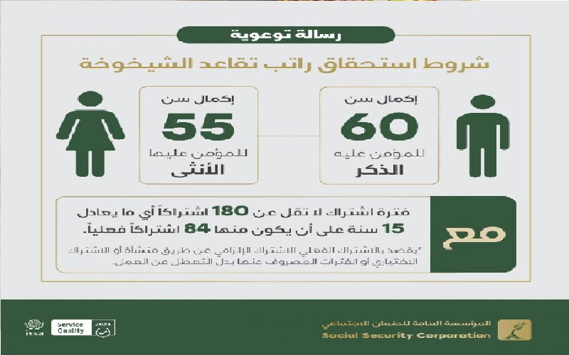 وأوضحت المؤسسة أن شروط استحقاق راتب تقاعد الشيخوخة هي إكمال سن الستين بالنسبة للمؤمن عليهم الذكور وإكمال سن الخامسة والخمسين بالنسبة للمؤمن عليهن الإناث مع مدة اشتراك بالضمان لا تقل عن 180 اشتراكاً أي ما يعادل (15) سنة على أن يكون من ضمنها (84) اشتراكاً فعلياً أي ما يعادل (7) سنوات، ويُقصد بالاشتراك الفعلي (الاشتراك الإلزامي من خلال منشأة أو الاشتراك الاختياري أو الفترات المصروف عنها بدل التعطل عن العمل).
