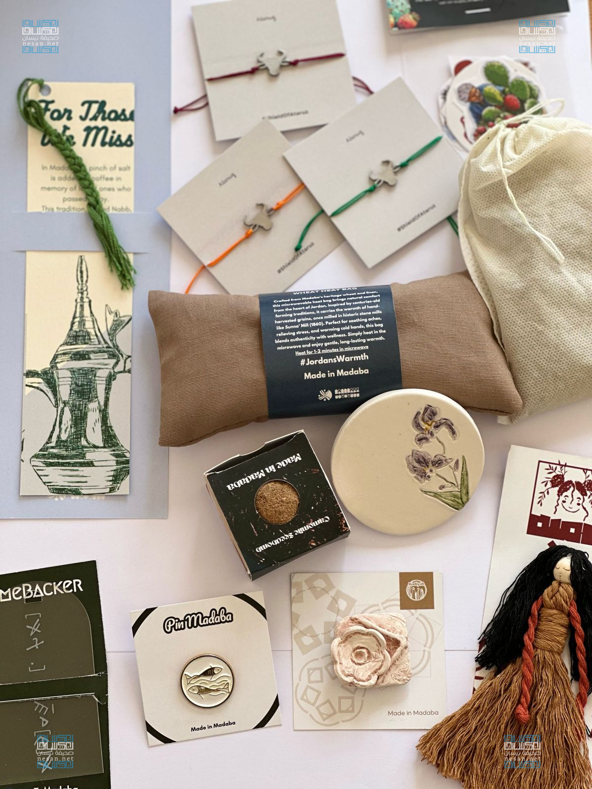 ومن المنتجات التي تم عرضها مغناطيس مصنوع من الطين مستوحى من واجهة قصر المشتى، والمغناطيس الذي يحكي صورة لمحارب مؤابي عثر عليه عام 1851 ومعروض حاليا في متحف اللوفر، وسوار مستوحى من خربة عطاروز الشهيرة في مادبا، وستكرز مستوحى من نبات الصبار الذي تشتهر في انتاجه مادبا، وميدالية تراثية مستوحاه من زينة الخيول المعروفة باسم "الشراشب".