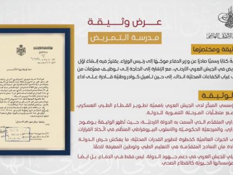 نيسان ـ عرض مركز التوثيق الملكي الأردني الهاشمي، وثيقة مؤرخة بتاريخ 27 حزيران 1961، تتضمن قرار إنشاء أول مدرسة للتمريض تابعة للجيش العربي الأردني.