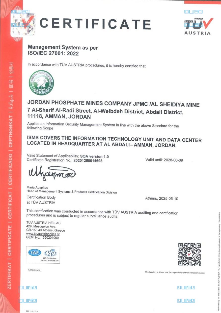 نيسان ـ حصلت دائرة تكنولوجيا المعلومات في شركة مناجم الفوسفات الأردنية على شهادة ISO/IEC 27001:2022 المعتمدة عالميا في نظام إدارة أمن المعلومات (ISMS)، والتي تمنحها شركة (TÜV Austria).