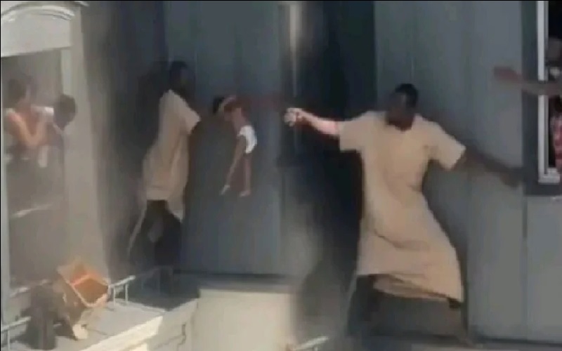 وفي لحظة شجاعة نادرة، خرج أحد الجيران من نافذة شقته، وسار بخطوات حذرة على حافة ضيقة لا تتجاوز بضعة سنتيمترات، بين السماء والأرض، لإنقاذ الأطفال والبالغين من شقّة تلتهمها النيران.