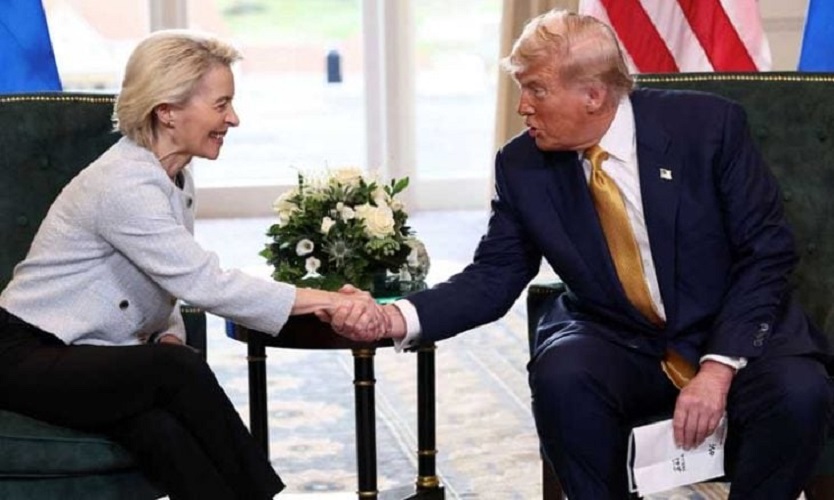 نيسان ـ توصلت الولايات المتحدة والاتحاد الأوروبي إلى توافق بشأن الرسوم الجمركية، بحسب ما أعلنه دونالد ترامب وأورسولا فون دير لاين في ختام لقائهما هذا الأحد في إسكتلندا.