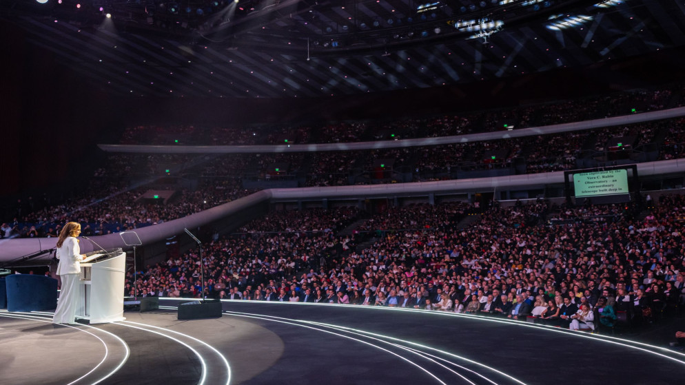 واختتمت جلالة الملكة كلمتها باقتباس من القرآن الكريم للآية 46 من سورة الحج: "أَفَلَمْ يَسِيرُوا فِي الأَرْضِ فَتَكُونَ لَهُمْ قُلُوبٌ يَعْقِلُونَ بِهَا أَوْ آذَانٌ يَسْمَعُونَ بِهَا ۖ فَإِنَّهَا لَا تَعْمَى الأَبْصَارُ وَلَٰكِنْ تَعْمَى الْقُلُوبُ الَّتِي فِي الصُّدُورِ" صدق الله العظيم.