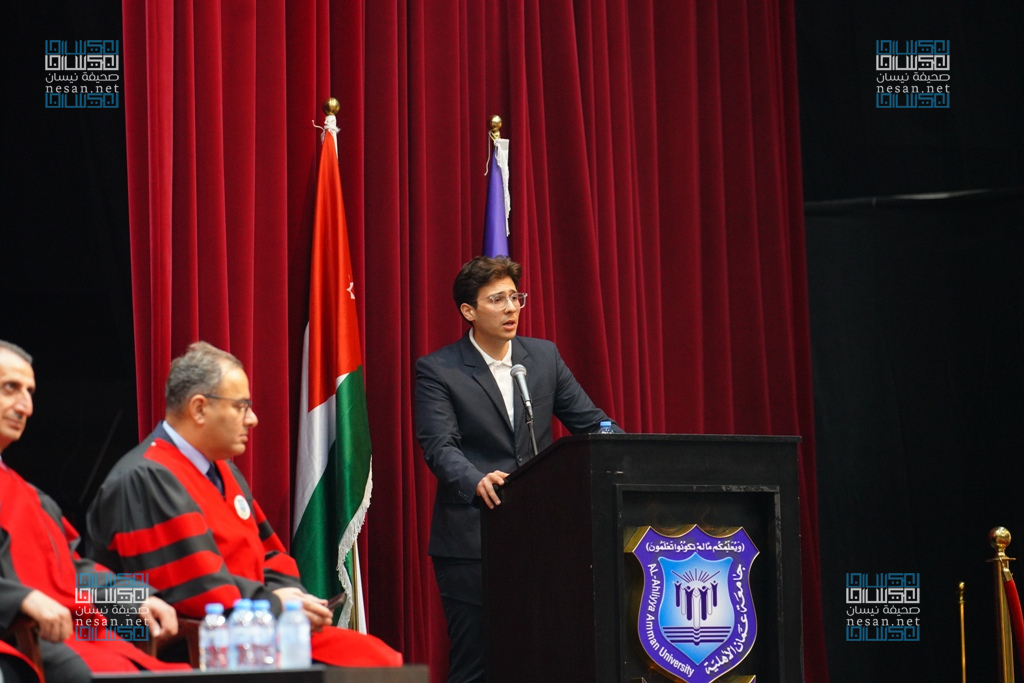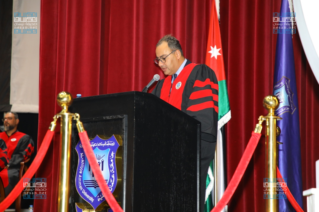 وأضاف : أيها الحضور الأجلّاء، من قلب الأردن النابض، من جامعةٍ وُلدت من رحم الرؤية والبصيرة، نحتفل اليوم تحت راية جامعة عمّان الأهلية، التي لم تكن يومًا مجرد صرح أكاديمي، بل كانت وما تزال منارةً تُشِعُّ علمًا وتميّزًا.