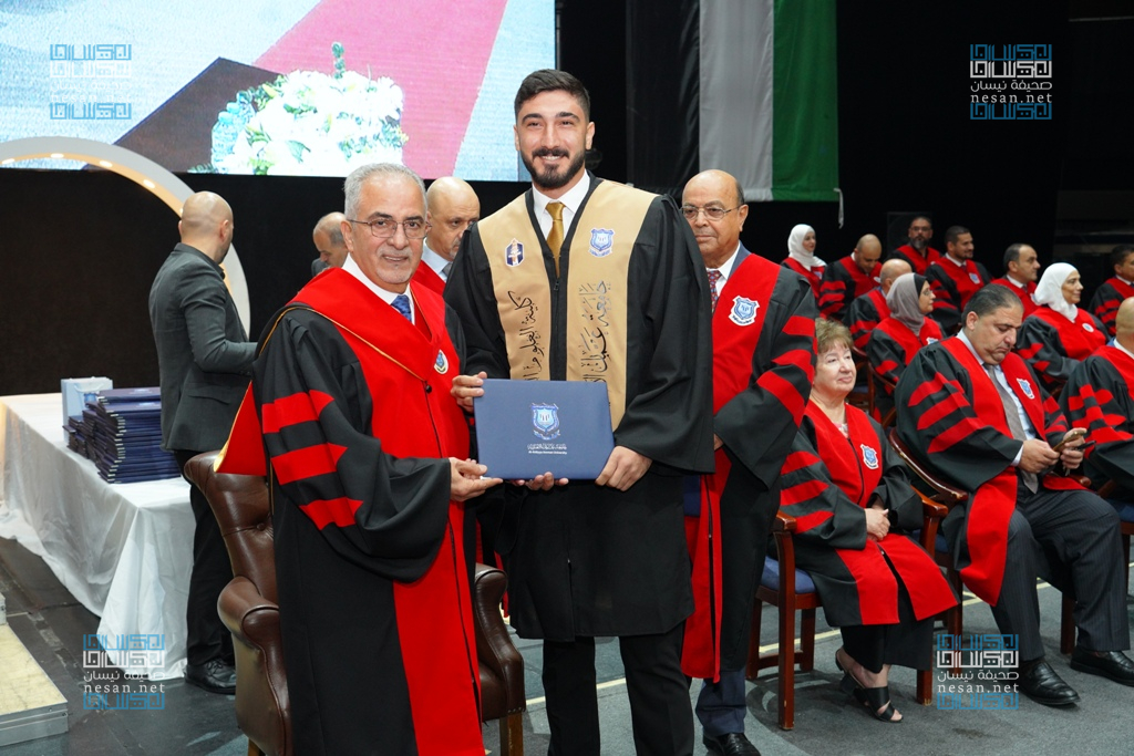 • وفي نهاية الحفل قام عطوفة راعي الحفل الاستاذ الدكتور ساري حمدان بتسليم الشهادات للخريجين والخريجات والجوائز التقديرية للمتفوقين والمتفوقات .
