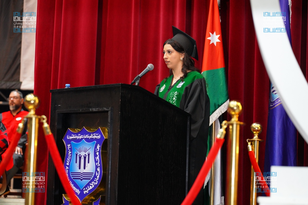 ثم باركت لزُمَلَائها وزميلاتها ٱلْـخَرِّيجِينَ وخاطبتهم قائلة : فِي لَحْظَةٍ تَفِيضُ فِيهَا ٱلْعُيُونُ بِٱلْكَلِمَاتِ، أَكْثَرَ مِمَّا يَفِيضُ ٱللِّسَانُ.فَلْنُوصِ أَنْفُسَنَا: أَنْ نَصُونَ مَا ٱكْتَسَبْنَاهُ، أَنْ نَكُونَ لِلْعِلْمِ أَوْفِيَاء لِلْوَطَنِ أَبْنَاءً بَرَرَةً، أَنْ نَكُونَ سُفَرَاءَ رِسَالَةٍ رُعَاةَ أَمَانَةٍ.لِنَجْعَلْ مِنْ أَحْلَامِنَا وَاقِعًا، وَلِنَجْعَلْ مِنْ أَيَّامِنَا ٱلْقَادِمَةِ، ٱلَّتِي سَتَشْهَدُ نَجَاحَاتِنَا، دليلًا عَلَى أَنَّنَا كُنَّا هُنَا، كُنَّا طُلَّابًا فِي جَامِعَةِ عَمَّانَ ٱلْأَهْلِيَّةِ.