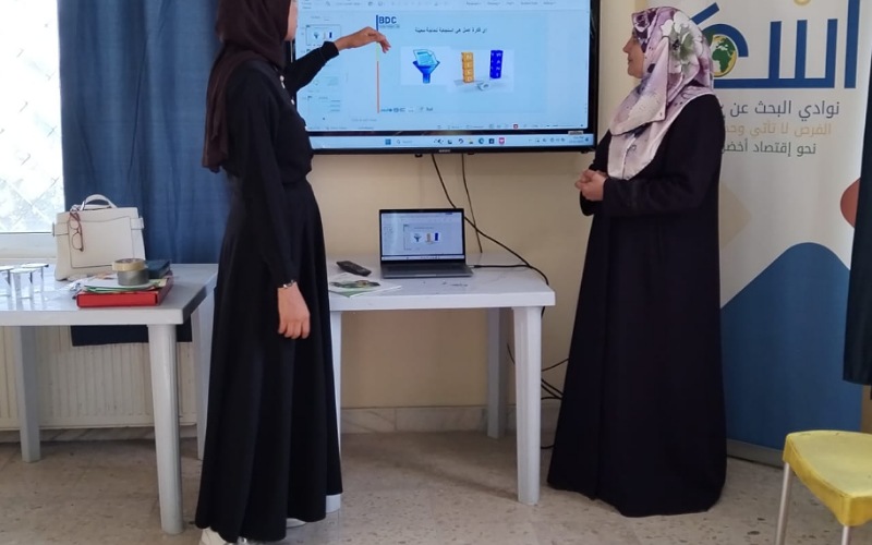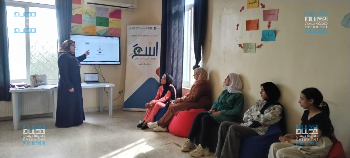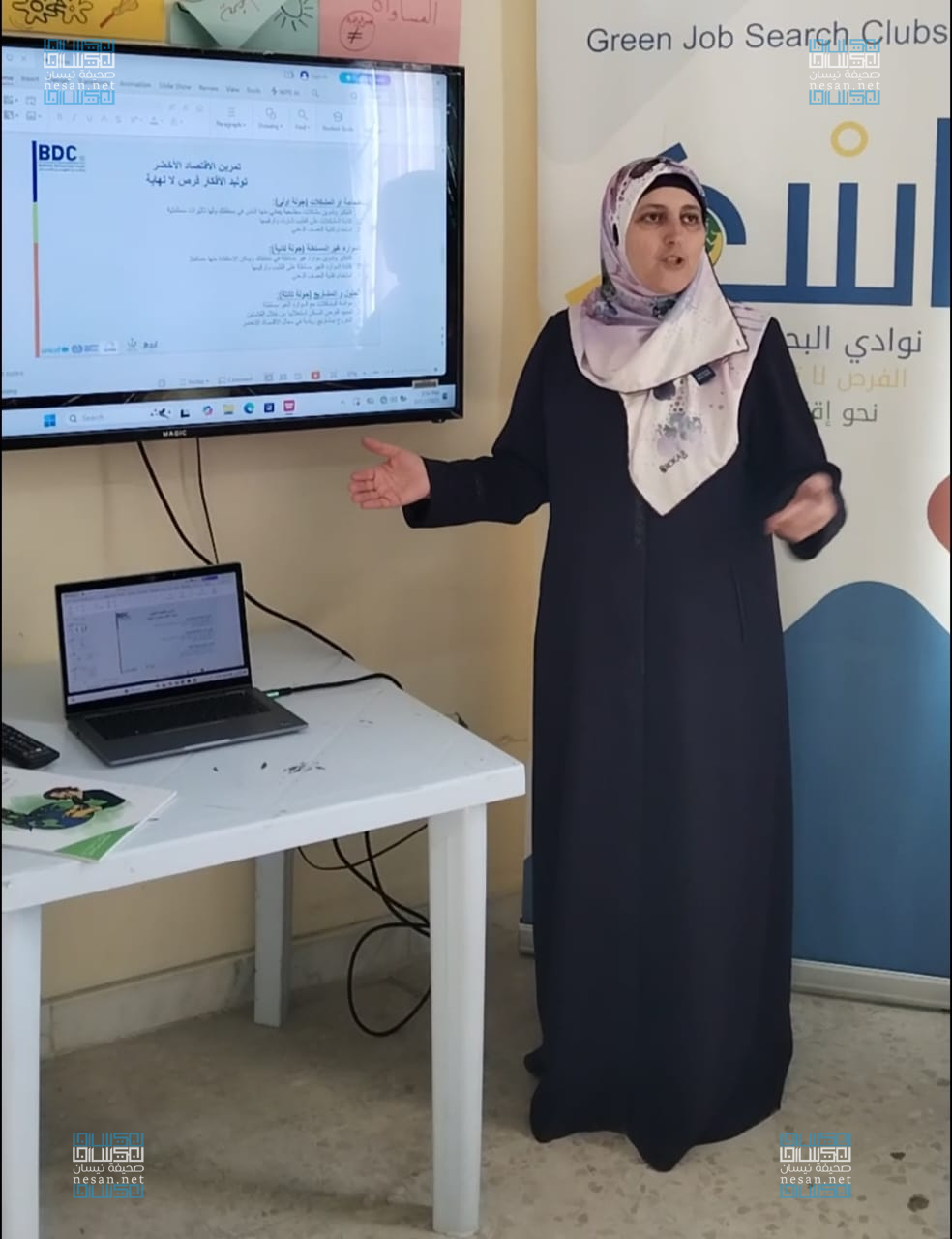 حيث قامت المدربة فاطمة البطاينة بتوجيه المشاركات نحو المهن الخضراء في الاقتصاد الاخضر في قطاعات انتاج وتوزيع الطاقة والمياه وقطاع الصرف الصحي ومعالجة النفايات وقطاع حماية الطبيعة والبيئة؛ لتنشيط الشابات واشراكهن في أنشطة البحث عن عمل وركزت على اهمية تسويق الذات والمهارات المرتبطة في البحث عن عمل،