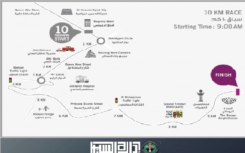 - كما ستشمل الإغلاقات كذلك شارع عقبة بن نافع وشارع الأميرة بسمة بشكل كامل، وذلك من الساعة السابعة صباحاً وحتى الساعة الثانية عشرة ظهراً، ضمن مسار سباق الـ10 كم الذي ينطلق في الساعة التاسعة صباحاً..