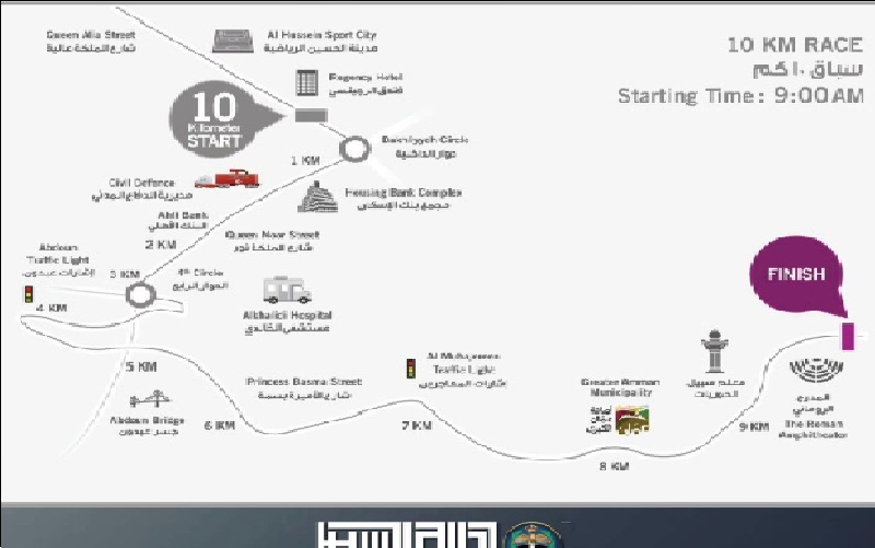 وستكون الإغلاقات على النحو التالي، إغلاق الطريق الممتد من مجمع المحطة مرورا بشارع الجيش باتجاهيه والساحة الهاشمية وشارع قريش وشارع علي بن أبي طالب وصولا إلى إشارات المهاجرين، مرورا بشارع عمر مطر وشارع الملك طلال وشارع الهاشمي، اعتبارا من الساعة الثانية عشرة بعد منتصف الليل وحتى الساعة الثانية عشرة ظهرا، ضمن مسار سباقي الـ 42 كم (الفردي/التتابع) و21 كم.