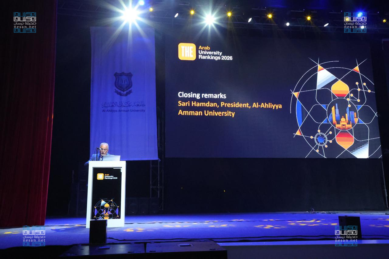 • وخلال حفل الختام، عبّر الأستاذ الدكتور ساري حمدان، رئيس جامعة عمّان الأهلية، عن اعتزازه بالنتائج التي حققتها الجامعة في التصنيف ، موجّهًا الشكر لجميع المشاركين ومهنئًا الجامعات التي ظهرت ضمن التصنيف.
