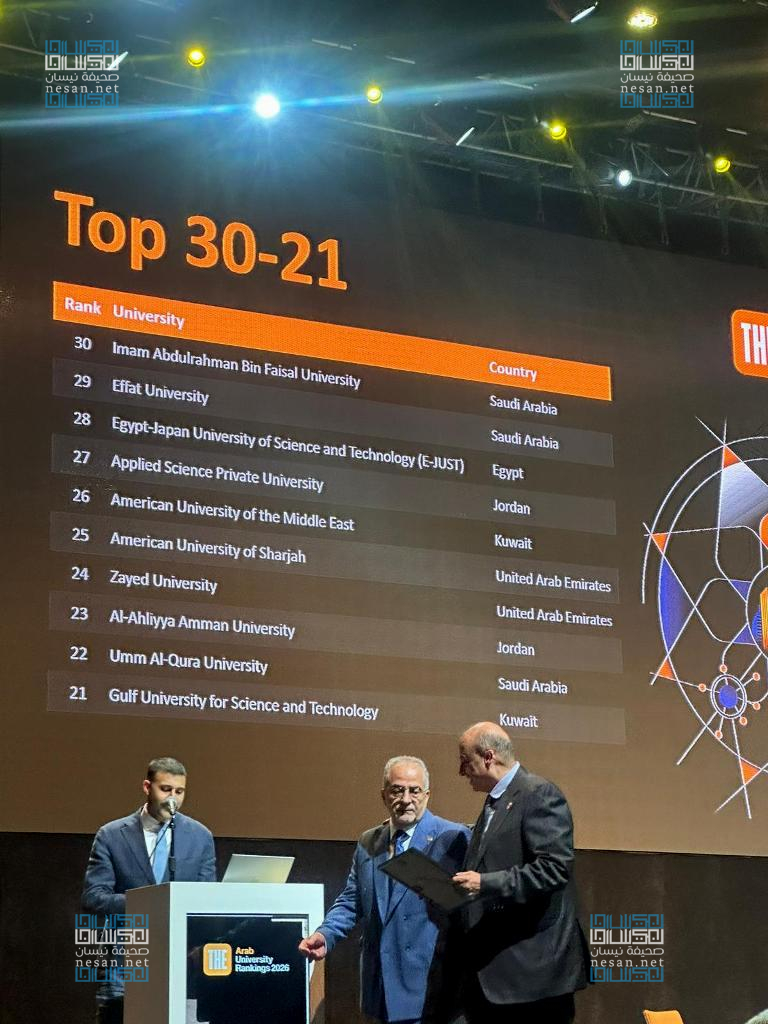 نيسان ـ أعلنت مساء امس مع اختتام فعاليات اليوم الثاني لقمة تصنيف التايمز العربي 2025 ، نتائج تصنيف التايمز العربي 2025 ( من 21- 30) وذلك على هامش أعمال قمة التايمز للجامعات العربية التي استضافتها جامعة عمّان الأهليّة بالشراكة مع الجامعة الأردنية، والتي تُعقد لأول مرة في الأردن بمشاركة واسعة من ممثلي الجامعات العربية وخبراء التصنيفات العالمية.