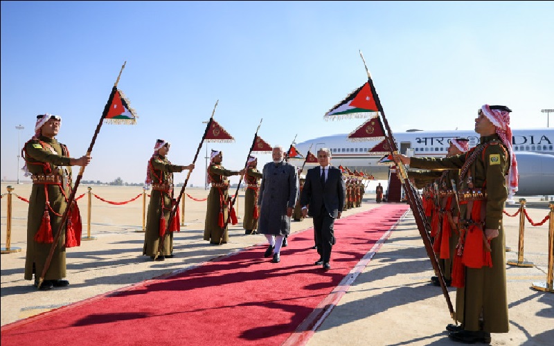 وجرت للضَّيف مراسم استقبال رسميَّة لدى وصوله مطار الملكة علياء الدَّولي، حيث اصطفّ حرس الشرف لتحيَّته، وعزفت الموسيقى السَّلامين الجمهوري الهندي والملكي الأردني.