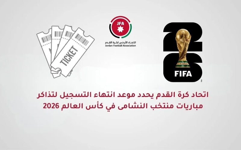 نيسان ـ أعلن اتحاد كرة القدم، أن يوم الثلاثاء الـ13 من الشهر الحالي هو آخر موعد للتسجيل والحصول على التذاكر المخصصة للجماهير الأردنية لمباريات المنتخب الوطني في نهائيات كاس العالم 2026.