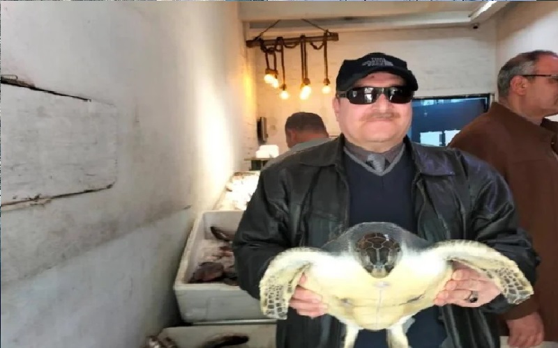 إنقاذ سلحفاة بحرية مهددة بالانقراض عالمياً بمحل أسماك